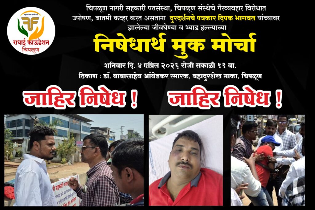 चिपळूण : पत्रकारावर झालेल्या भ्याड हल्ल्याच्या निषेधार्थ तसेच संबंधित आरोपींना अद्याप अटक न झाल्याच्या पार्श्वभूमीवर राधा ही फाउंडेशनतर्फे मूक मोर्चाचे आयोजन करण्यात आले आहे.