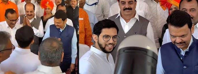 विधानभवनाच्या पायऱ्यांवर उभं राहून देवेंद्र फडणवीस यांच्या उपस्थितीत महायुतीच्या आमदांनी घोषणाबाजी केली. तेव्हाच आदित्य ठाकरे हे सभागृहात जात होते. यावेळी पायऱ्यांवरून जाताना आदित्य ठाकरे देवेंद्र फडणवीस यांच्याकडे गेले, त्यांच्याशी हात मिळवत त्यांना शुभेच्छा दिल्या. यावेळी देवेंद्र फडणवीस यांनीही एक पाऊल पुढे येऊन आदित्य ठाकरेंच्या शुभेच्छा स्वीकारल्याचं पाहायला मिळालं.