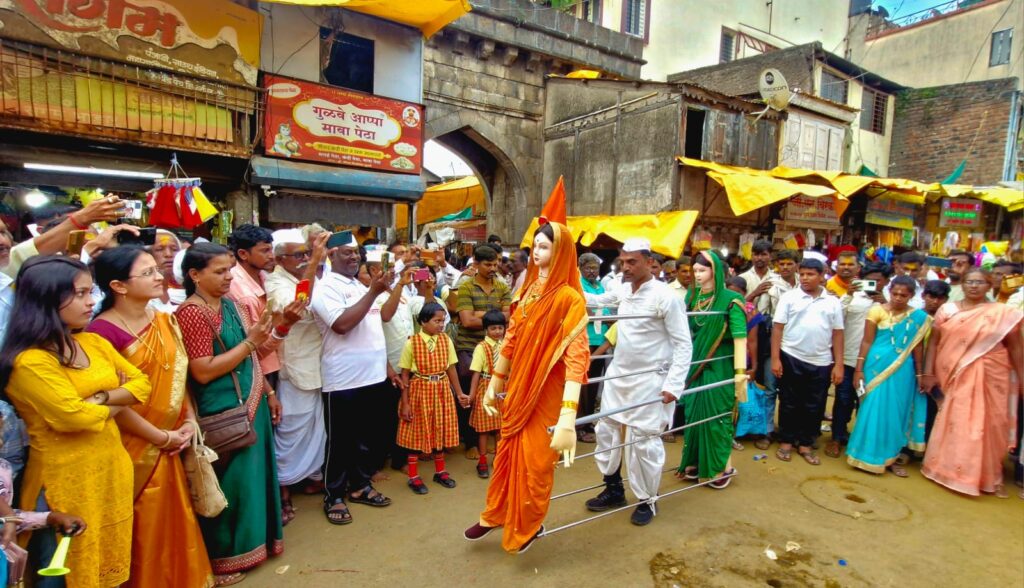 पुरंदर जेजुरी : धार्मिक आद्यात्मिक सामाजिक आणि शैक्षणिक जीवन मूल्यांचे महत्व सांगणारी आणि संत साहित्याची परिक्रमा असणाऱ्या बहुरंगी बहूढंगी लोकरंगातील पंढरीच्या वारीत विशेष लक्षवेधी ठरलेल्या साक्षरता दिंडीच्यावारीचे प्रचार प्रसार करण्याचे कामकाज स्वयंसेवक नागसेन साबळे यांनी *जेजुरी नगरीत नंदी चौक* येथे उपस्तिथ वारकरी ग्रामस्थांचें विशेष प्रबोधन *कठ पुतळी गीत नृत्य* सादर करून केले.