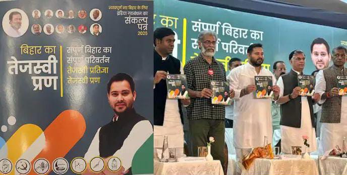 ‘तेजस्वींचा प्रण’ असे ब्रँडिंग करण्यात आलेल्या या दस्तऐवजाच्या मुखपृष्ठावर आरजेडी (RJD) नेत्याचा प्रमुख फोटो आहे, तर राहुल गांधींचा लहान फोटो वरच्या डाव्या कोपऱ्यात दिसतो आहे. हा तपशील आघाडीतील बदलत्या राजकीय केंद्राचे स्पष्ट संकेत देतो.