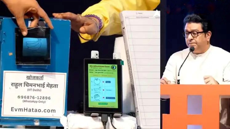 मुंबईतल्या रंगशारदा सभागृहात राज ठाकरेंनी आज सभा घेतली. या सभेमध्ये त्यांनी मनसेच्या कार्यकर्त्यांना तर संबोधित केलंच पण त्याचबरोबर पुन्हा एकदा लाव रे तो व्हिडिओ प्रमाणं EVM मशिन्समधून कशा प्रकारे मतचोरी केली जाते, याचा लाईव्ह डेमो दिला. राहुल चिमणभाई मेहता या दिल्ली आयआयटीमधून सॉफ्टवेअर इंजिनिअरिंग आणि अमेरिकेतून कॉम्प्युटर सायन्सचं शिक्षण घेतलेल्या एका इंजिनिअरनं तयार केलेल्या EVM Black glass and EVM light Sensor Vote Theft मशिन्स या डेमोमध्ये वापरण्यात आल्या. अमित उपाध्याय यांनी ‘ईव्हीएम हटाव सेना’ द्वारे तयार केलेल्या डेमो EVM मशिनमधून मतचोरीचं प्रात्यक्षक दाखवलं.