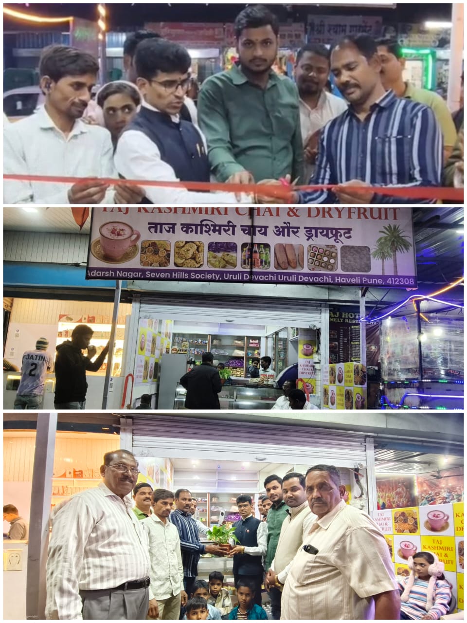 पुणे : उरुळी देवाची (ता. हवेली) येथील आदर्श नगर, सेवन हिल्स सोसायटी परिसरात नव्याने सुरू झालेल्या ताज काश्मिरी चहा अॅण्ड ड्रायफ्रूट या हॉटेलचे उद्घाटन श्री. डि. एस. लोखंडे पाटील यांच्या शुभहस्ते आज करण्यात आले.