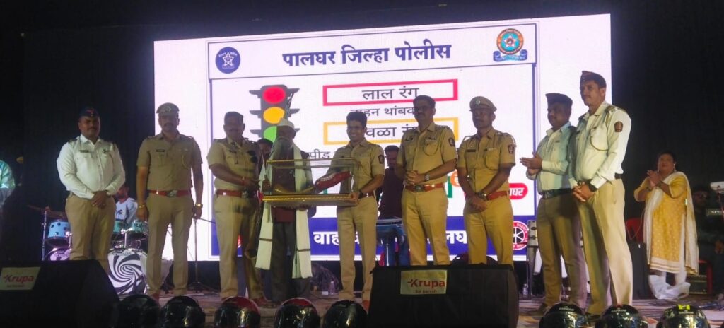 बोईसर :पालघर जिल्हा पोलीस दलाच्या पुढाकाराने राबविण्यात आलेल्या ३७ व्या रस्ता सुरक्षा अभियान २०२६ चा सांगता समारोप सोहळा नागझरी (ता. जि. पालघर) येथील अधिकारी ब्रदर्स मैदान, संस्कृती शाळेजवळ उत्साहपूर्ण वातावरणात पार पडला. सुरक्षित वाहतूक, नियमांचे पालन आणि नागरिकांमध्ये जनजागृती या त्रिसूत्रीवर आधारित या अभियानाचा समारोप विविध मान्यवरांच्या उपस्थितीत करण्यात आला.