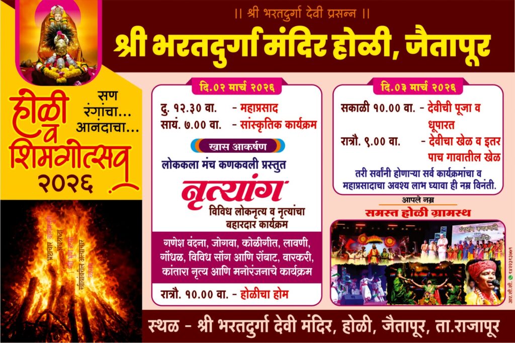 जैतापूर :- ( होळी) :- ऐतिहासिक वारसा असणारे राजापूर तालुक्यातील होळी गाव,आणि या होळी गावचे ग्रामदैवत आई भरत दुर्गा,साक्षात सवाई माधवराव पेशवेकालीन इतिहास असणारी हे होळी गाव आणि या आई चा मार्च मध्ये होणार शिमगोत्सव काही दिवसावर येऊ घातला आहे.अतिशय सुंदर अश्या नियोजनबद्ध पद्धतीने कार्यक्रम हे दरवर्षी साजरे होत असतात.