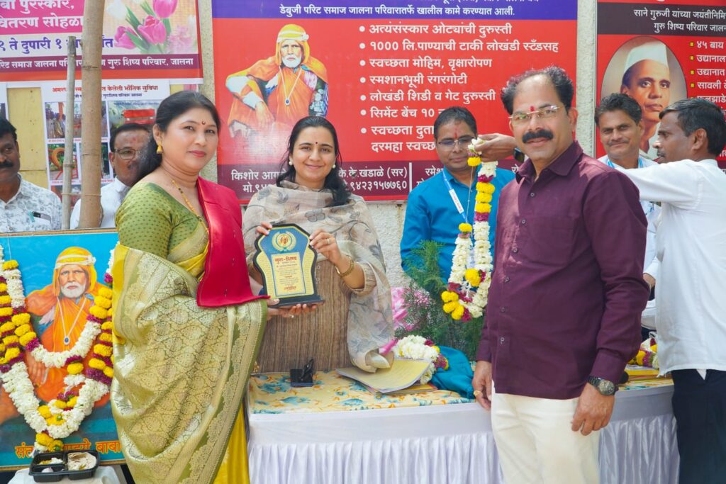 अंबड : संत गाडगेबाबा यांच्या १५० व्या जयंतीचे औचित्य साधून डेबूजी परीट समाज व गुरु-शिष्य परिवाराच्या वतीने आयोजित कार्यक्रमात, स्वप्नपूर्ती महिला फाउंडेशनच्या संस्थापक अध्यक्षा सुमनताई विष्णूकुमार शेळके यांना प्रतिष्ठित ‘गुरु-शिष्य’ पुरस्काराने सन्मानित करण्यात आले. जालना जिल्हाधिकारी आशिमा मित्तल यांच्या हस्ते हा गौरव सोहळा पार पडला.