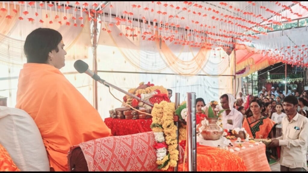 भगवंतांनी आपणाला हा अत्यंत पवित्र मानवी देह दिला आहे तेव्हा त्याला विविध व्यसनाच्या आहारी जाऊ न देता स्वच्छ ठेवावे. गळ्यात तुळशीची माळ धारण करावी, प्रभुचे चिंतन करीत जावे, पोषणयुक्त शाकाआहार विहार ठेवावा. तसेच लवकर झोपावे लवकर उठावे सर्व गोष्टी मर्यादित ठेवाव्यात असे सांगितले. ” युक्त आहार विहारस्य युक्त चेष्टसे कर्मसु ” हा गीतेचा सिद्धांत पटवून सांगितला. लवकर झोपे लवकर उठे, तया ज्ञान संपत्ती आरोग्य भेटे हा सिद्धांत ही विविध दृष्टांत देऊन पटवून सांगितला व जीवनात राग आणि द्वेष बाजूला सारून विवेकाने जीवन जगावे हाच खरा या श्रीमद् देवी भागवत महापुराण कथेचा संदेश आहे असे सांगितले. त्यांच्या रसाळ वाणीतून होत असलेल्या अर्थपूर्ण कथेचा लाभ गावातील व परिसरातील शेकडो भाविक भक्त व माता-भगिनी मोठ्या संख्येने घेत आहेत.