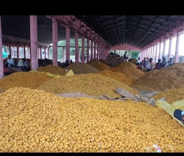 हिंगोली येथील कृषी उत्पन्न बाजार समितीच्या यार्डात सोमवारी हळदीची मोठ्या प्रमाणात आवक झाली होती.