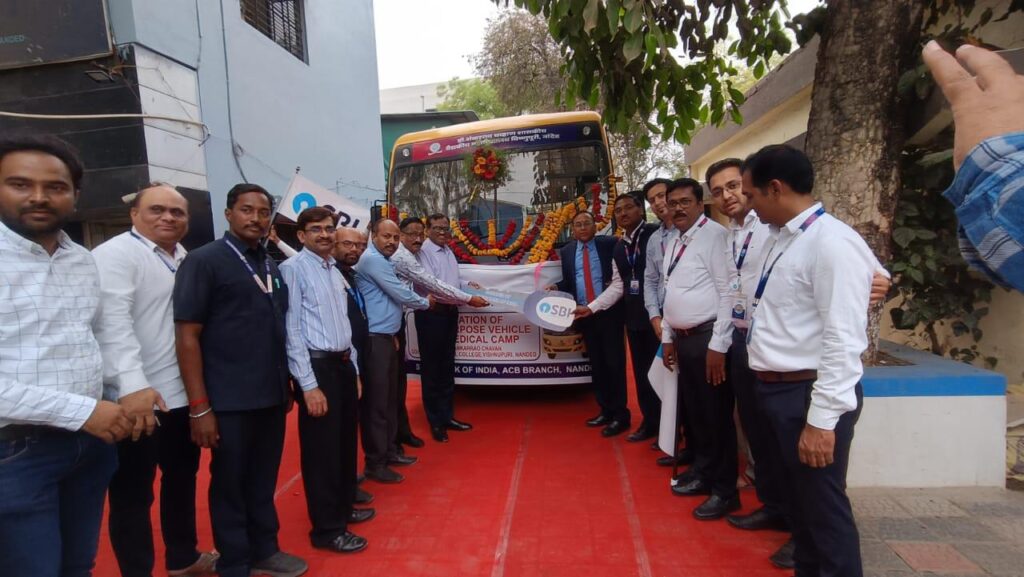नांदेड दि. 2 एप्रिल :- भारतीय स्टेट बँकेकडून सामाजिक उत्तरदायित्व निधी सीएसआर अंतर्गत एक 40 आसन क्षमतेची बस डॉ. शंकरराव चव्हाण शासकीय वैद्यकीय महाविद्यालय व रुग्णालय विष्णुपूरी नांदेड यांना देणगी स्वरुपात भेट देण्यात आली. ही बस वैद्यकीय महाविद्यालयाचे अधिष्ठाता डॉ. सुधीर देशमुख यांच्याकडे नुकतीच सुर्पूद करण्यात आली. हा कार्यक्रम भारतीय स्टेट बँकेच्या शिवाजीनगर येथील प्रशासकीय कार्यालयात संपन्न झाला.