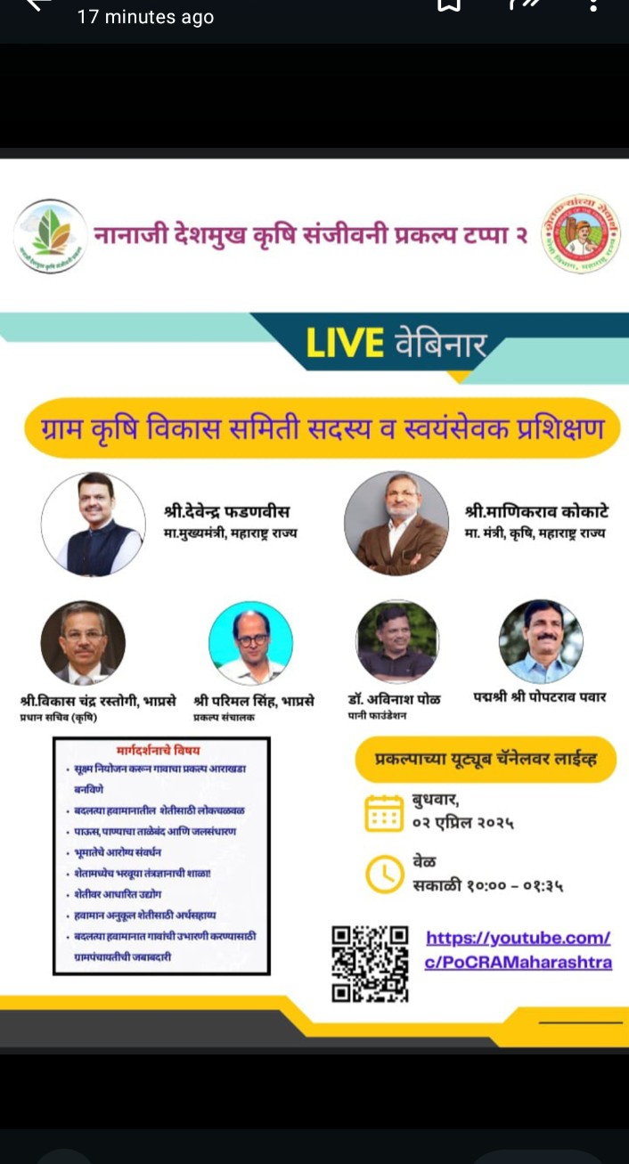 नानाजी देशमुख कृषी संजीवनी योजना टप्पा २ चे लाईव्ह बेमिनार आज सकाळी दहा वाजेपासून ते तीन वाजेपर्यंत यशस्वीरित्या पूर्ण झाले.