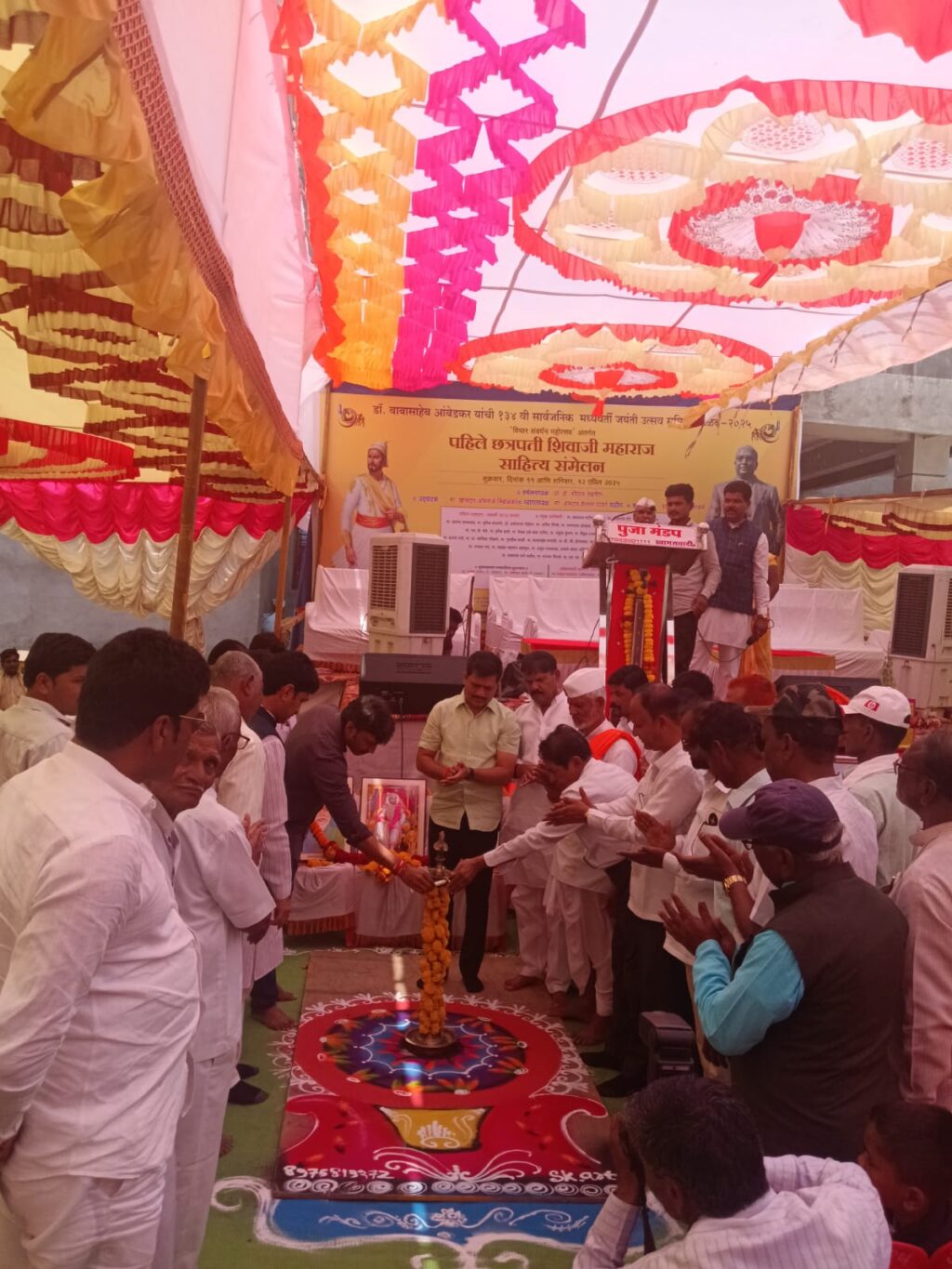 महामानवाच्या कर्तृत्वाला साजेशी जयंती साजरी व्हावी परंतु आज उत्सवाचा सार डॉल्बी बनत आहे याचे दुष्परिणामापासून वाचविण्यासाठी जागृत नागरिक म्हणून आपली जिम्मेदारी आहे जयंती कोणत्या पद्धतीने कशी साजरी करतोय याचा विचार व्हावा जयंती उत्सवात डॉल्बी साठी अनावश्यक खर्च केला जात आहे हे अनावश्यक पैसे खर्च होत आहेत हे पैसे विद्यार्थ्यांच्या शिक्षणासाठी खर्च व्हावेत असे विचार पहिले छत्रपती शिवाजी महाराज साहित्य संमेलनात संमेलनाचे उद्घाटक म्हणून धाराशिव लोकसभा मतदारसंघाचे खासदार ओम राजे निंबाळकर यांनी व्यक्त केली डॉ. बाबासाहेब आंबेडकर यांची 134 वी जयंती निमित्त विचार संवर्धन महोत्सव अंतर्गत पहिले छत्रपती शिवाजी महाराज साहित्य संमेलन दिनांक 11 व 12 एप्रिल रोजी संस्कृती सभागृह मेन रोड कळंब येथे संपन्न होत आहे याप्रसंगी मंचावर माजी आमदार दयानंद गायकवाड, साहित्यिक शिवानंद भानुसे, कॉ. अरुण रेणके, सर्फराज अहमद, भास्कर खोसे, महादेव महाराज अडसूळ प्राध्यापक वर्षा जाधव, प्रा मीनाक्षी शिंदे, ज्योती सपाटे , त्रिंबकराव मनगिरे , अतुल गायकवाड,यांच्यासह संमेलनाचे स्वागत अध्यक्ष आमदार कैलास दादा घाडगे पाटील कार्याध्यक्ष प्रा. डॉ. संजय कांबळे, यांची उपस्थिती होती आपल्या उद्घाटनाच्या भाषणात पुढे बोलताना खासदार ओमराजे निंबाळकर यांनी माणूस म्हणून एकच जात धर्म आहे माणुसकीने वागणे कर्तव्य आहे समाजात विघात कृती वाढत आहे समाजाने कृती कशासाठी केली जाते हे ओळखावे आज खरच लोकशाही आहे का ? हा प्रश्न निर्माण झाला आहे जिल्हा नियोजन निधीचा पैसा जनतेचा आहे मी खासदार म्हणून त्याचा विश्वस्त आहे परंतु या कामात राजकारण केले जात आहे असे सांगून खासदार निंबाळकर यांनी आपण आपलं काम व नाव जपायचे काम करीत असून यासाठी कोणत्याही संकटाला तोंड देण्याची तयारी आहे असे सांगितले तर आपल्या स्वागत अध्यक्ष भाषणात आमदार कैलास पाटील यांनी आज कळंब शहरात डॉ.बाबासाहेब आंबेडकर जयंती निमित्त पहिले छत्रपती शिवाजी महाराज साहित्य संमेलन घेतले जात आहे हा अनोखा प्रयोग आहे यामुळे निश्चितच देशाला दिशा मिळेल असे सांगून महापुरुषांना जातीपुरते मर्यादित केले जात असून समाजा समाजात तंटे लावून राजकारणी पोळी भाजून घेत आहे संविधानाप्रमाणे काम करण्यासाठी एक संघ भारत निर्माण करण्यासाठी कार्य करण्याची गरज आहे असे सांगितले , संमेलन अध्यक्ष , ज्येष्ठ पत्रकार मधु कांबळे दैनिक लोकसत्ता यांनी आपल्या भाषणात साहित्य म्हणजे काय असा प्रश्न विचारून साहित्यातून समाज किती बदलतो यावरून साहित्य महान आहे की निरर्थक साहित्य आहे हे समजते असे सांगून परिस्थिती बदलायची असेल तर महामानवांना जातीत वाटण्यापेक्षा महामानवाच्या व