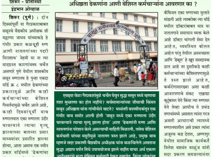 दैनिक चालु वार्ताच्या बातमीचा दणका!ससून रुग्णालय प्रशासनास जाग वार्ड मध्ये ढेकणांवर फवारणी सुरू, परंतु याप्रकरणी अधिष्ठता यांचा अजब गजब खुलासा…” 1 min read खास खबर महाराष्ट्र दैनिक चालु वार्ताच्या बातमीचा दणका!ससून रुग्णालय प्रशासनास जाग वार्ड मध्ये ढेकणांवर फवारणी सुरू, परंतु याप्रकरणी अधिष्ठता यांचा अजब गजब खुलासा…” दै चालु वार्ता 7 months ago दैनिक चालु वार्ता शिरूर प्रतिनिधी -इंद्रभान ओव्हाळ शिरूर (पुणे) “सामाजिक कार्यकर्ते निलेश यशवंत वाळुंज यांच्या प्रयत्नांना यश...Read More
