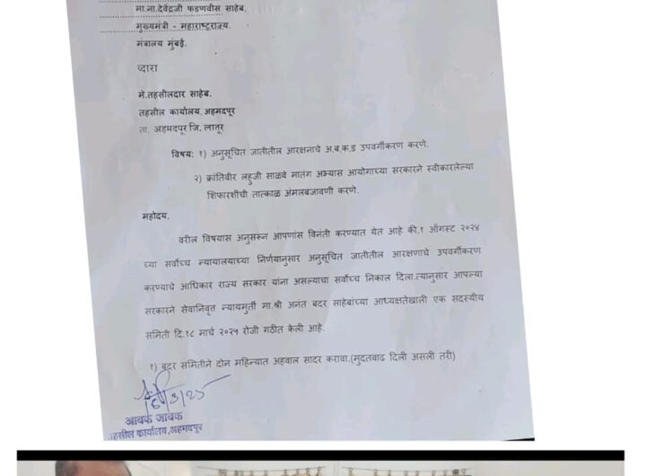 अहमदपूरातील सकल मातंग समाजाच्या वतीने तहसीलदार यांना निवेदन 1 min read खास खबर महाराष्ट्र अहमदपूरातील सकल मातंग समाजाच्या वतीने तहसीलदार यांना निवेदन दै चालु वार्ता 7 months ago दैनिक चालु वार्ता अहमदपुर प्रतिनिधी- श्री हाणमंत जी सोमवारे (अनुसूचित जातीतील अ ब क ड वर्गीकरण तर...Read More