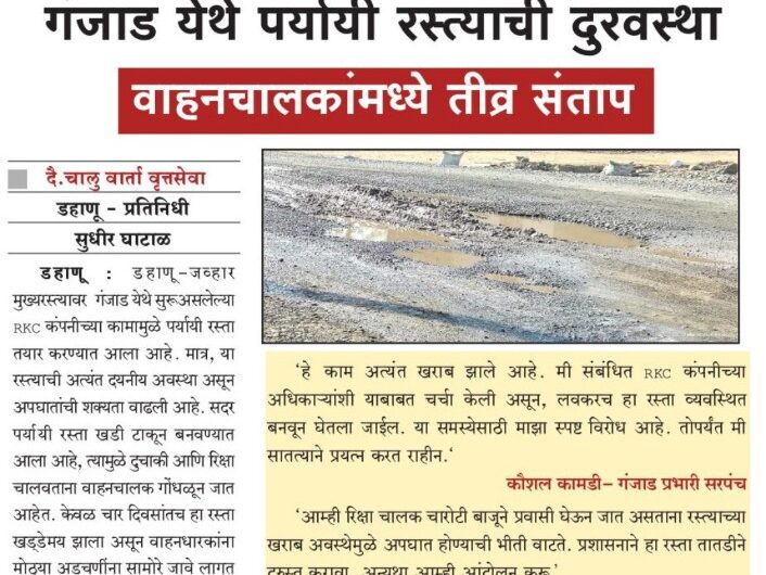 दैनिक चालु वार्ता डहाणू प्रतिनिधी – सुधीर घाटाळ गंजाड येथे RKC कंपनीच्या कामामुळे बनवण्यात आलेल्या खडिकरणाच्या पर्यायी रस्त्यामुळे...